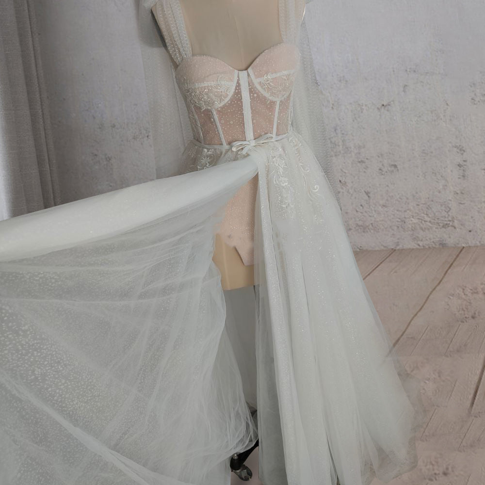 Crafted from delicate tulle and lace fabric, and available in White-Nude, Diamond White, Black, and Champagne, this wedding dress features a flattering A-line silhouette that gracefully flows into a romantic sweep train. The feminine sweetheart neckline and sleeveless design beautifully frame the shoulders, while intricate appliques add texture and charm throughout. A daring side slit adds movement and a touch of sensuality, perfect for the bride who wants to make a subtle yet unforgettable statement. Finished with a sleek zipper back, this dress is a standout among elegant bridal gowns, ideal for garden weddings, beach ceremonies, or chic city celebrations.