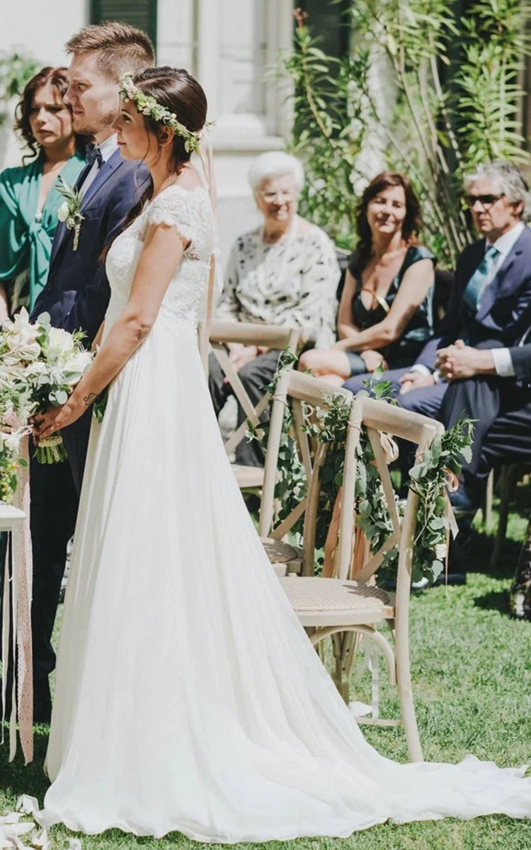 High-end A Line Jewel Chiffon Sweep Train Wedding Dress with Appliques