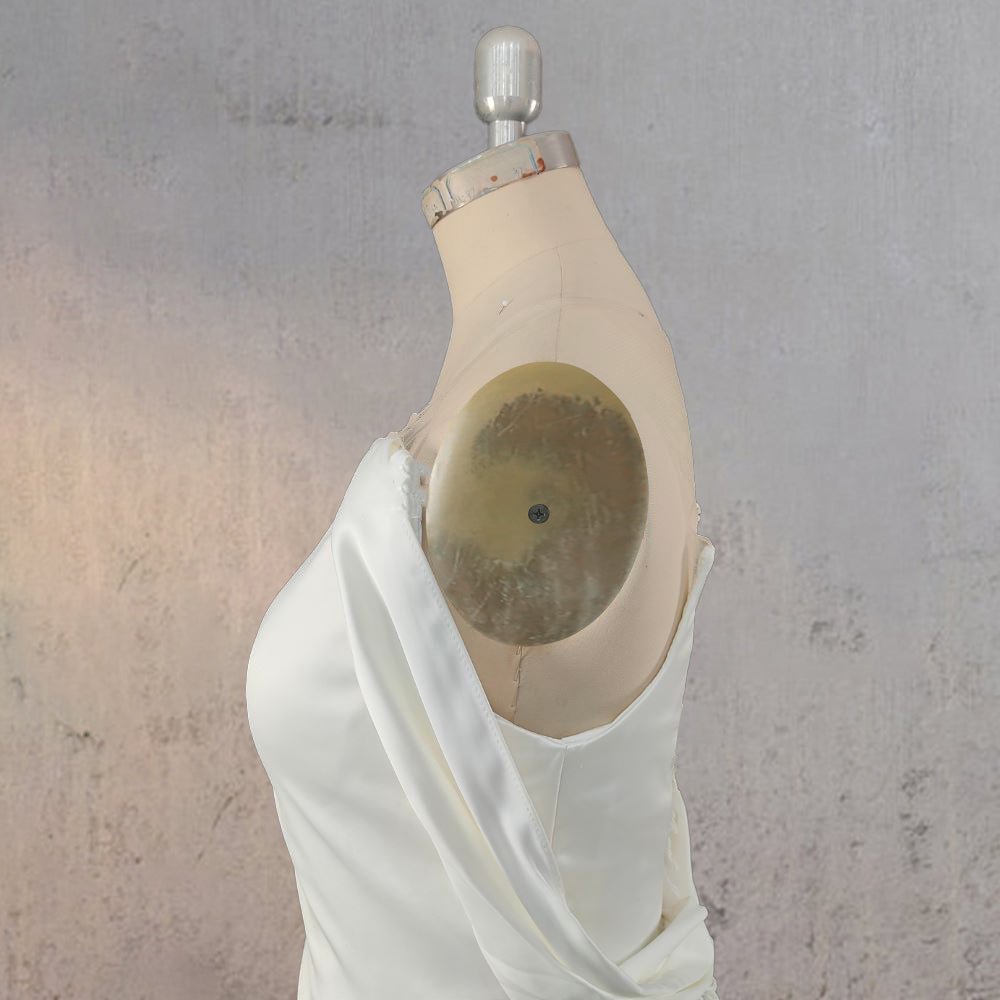 Crafted from luxurious satin fabric in elegant Diamond White, Champagne, or Black, this wedding dress features a flattering mermaid silhouette that hugs your curves and flows into a graceful sweep train. The romantic off-the-shoulder neckline beautifully frames the shoulders, while delicate lace appliques add intricate texture and sophistication. The daring backless design creates a striking and sensual look, making this dress a standout choice among contemporary bridal gowns.