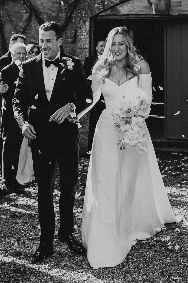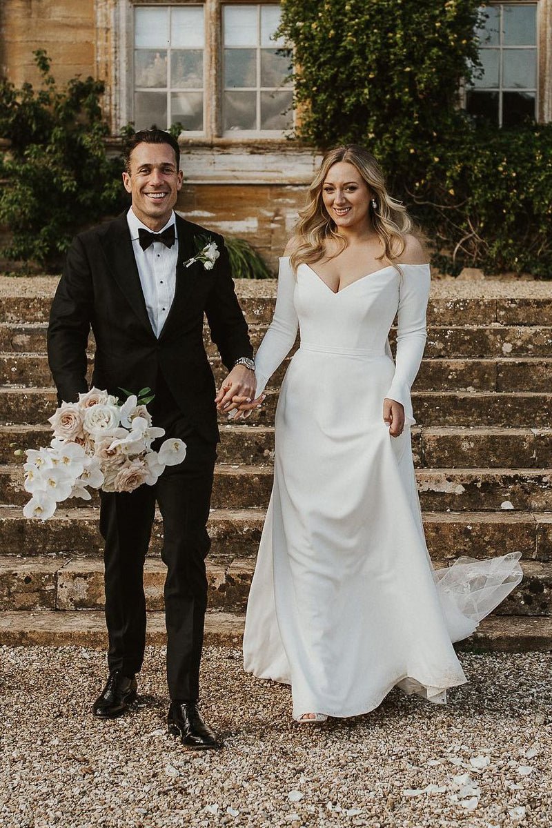 Simple A-Line Off the Shoulder Long Sleeves White Satin Wedding Dresses